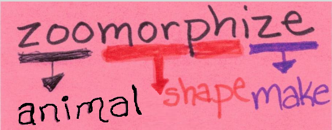 Explain the meaning of "zoomorphize" without saying "portray as an animal" or "describe in animalistic terms."