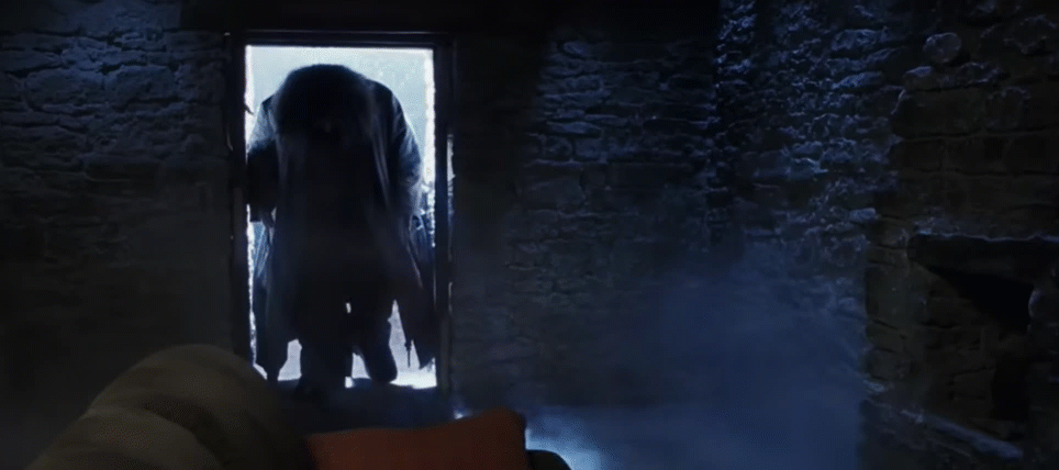 Here's the half-giant Hagrid, lumbering into the shack after breaking down the door. Actually, Hagrid lumbers everywhere he goes: he's almost twice as tall as a human, and not particularly graceful.