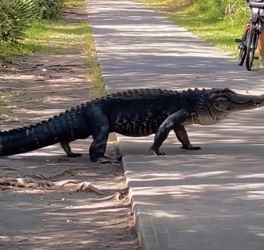 Here's an enormous alligator lumbering across a path. That means he's moving in a slow way, working hard to move his big, heavy body.