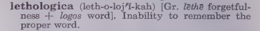 Explain the meaning of "lethologica" without saying "when you can't find a word" or "difficulty retrieving a word."
