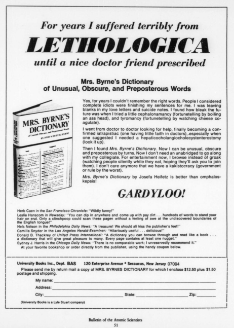 — University Books, Inc., advertisement in Bulletin of the Atomic Scientists, Volume 40, Issue 1, 1984