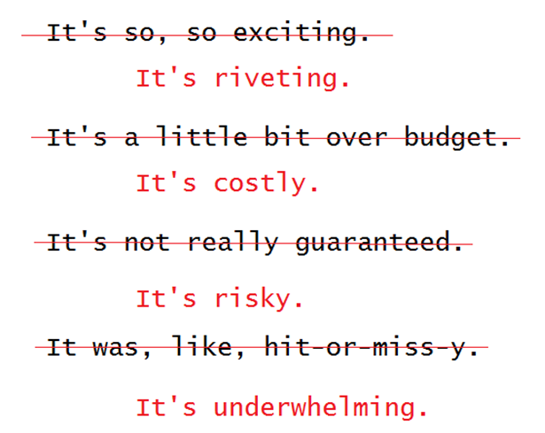 Focus also on when you overuse intensifiers (so, very, really, totally, completely) or detractors (not quite, kind of, sort of, a little bit) or negatives (not, none, isn't, can't).